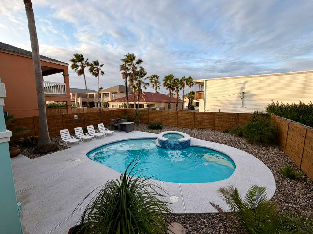 Yes, the patio and swimming pool are shared with two other units!